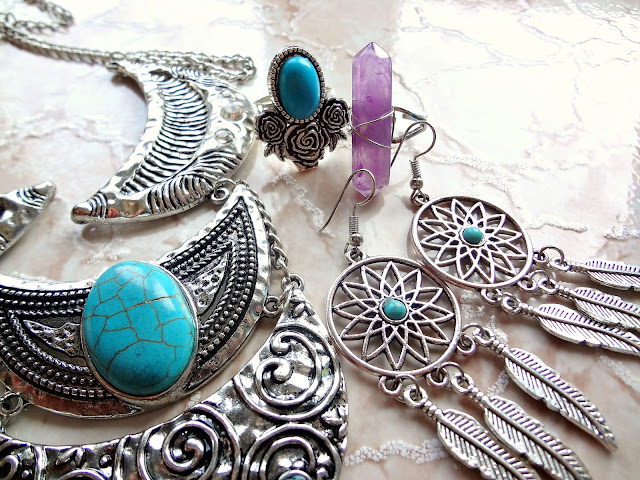 Now lets move on to jewellery. I got few pieces. First piece is gorgeous turquoise necklaces. I love big necklaces, I think they are great for making your outfit stand out a little bit more, especially when you are wear something simple, like sweater that I got. Next I got a gorgeous pair of earring also turquoise, if you followed me for a while you know that I love turquoise stuff. I like this earrings, cause they look like dream catchers, and they are perfect match with necklaces. Last two jewellery pieces that I got are rings. One is turquoise ring with rose details, so it goes perfect with necklaces, and earrings, and another one is pink crystal ring. This crystal is actually not a real crystal its made out of plastic, but its very cute, and since I got it I wore it probably every single day.